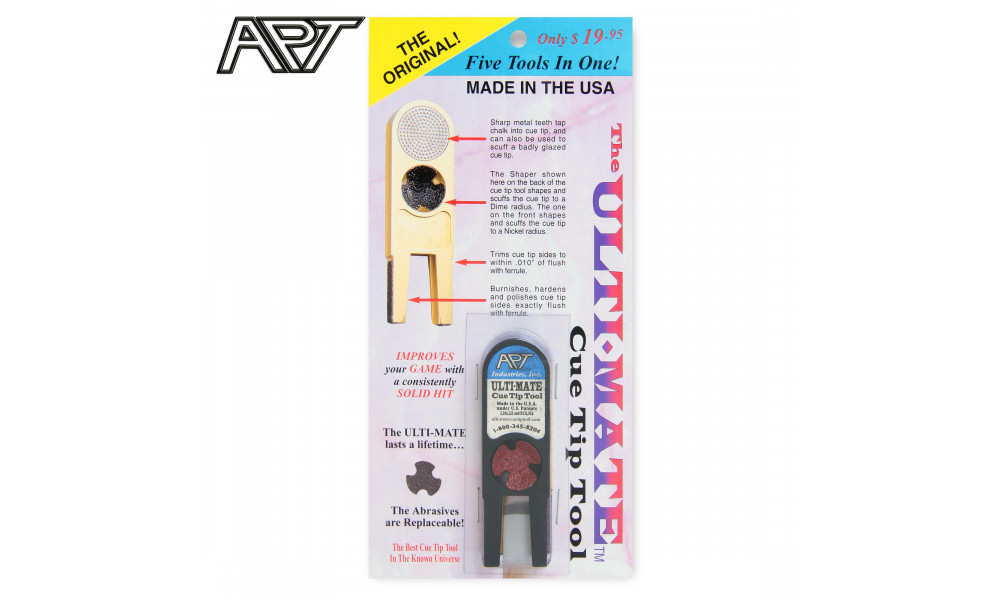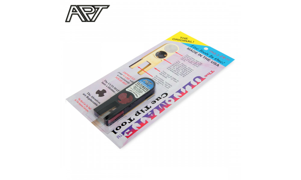 Изготовленный из полимера инструмент Ulti-Mate Cue Tip Tool содержит сменные абразивные элементы и предназначен для выполнения нескольких различных операций по обработке наклеек: